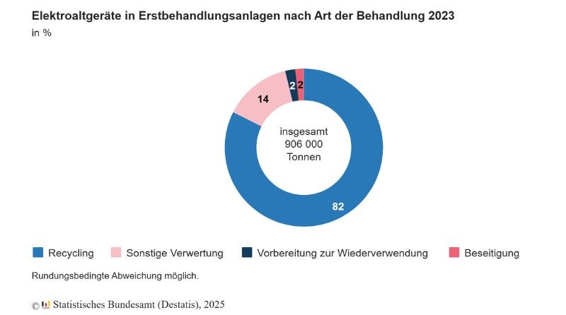 747 000 Tonnen Elektro- und Elektronikaltgeräte wurden im Jahr 2023 recycelt. Das waren gut vier Fünftel (82,4 Prozent) der insgesamt 906 100 Tonnen solcher Geräte, die von sogenannten Erstbehandlungsanlagen angenommen wurden, wie das Statistische Bundesamt (Destatis) anlässlich des Internationalen Tags des Elektroschrotts (E-Waste Day) am 14. Oktober 2025 mitteilt.