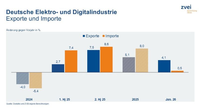 Auch zum Beginn des Jahres 2026 verzeichnete die deutsche Elektro- und Digitalindustrie ein Exportplus: Im Januar erzielten die aggregierten Branchenlieferungen ins Ausland einen Wert von 20,4 Milliarden Euro, ...