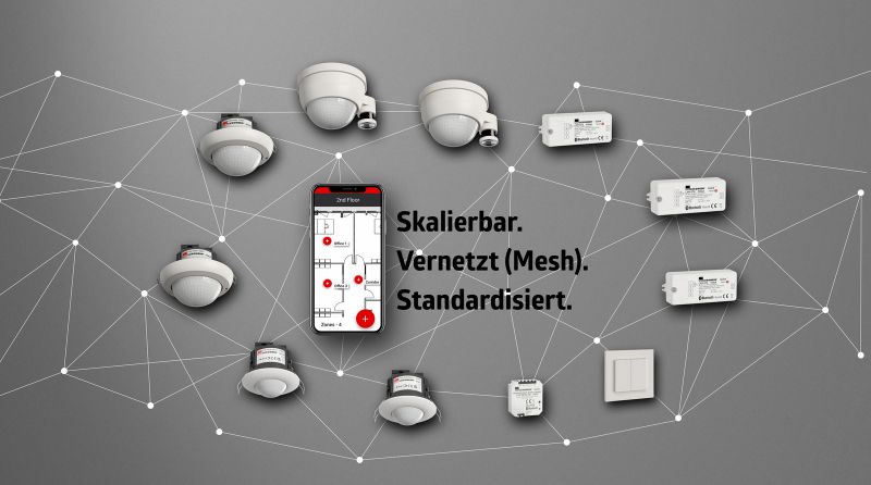 Überall dort, wo Modernisierung auf begrenzte bauliche Eingriffsmöglichkeiten trifft, sind innovative Lösungen gefragt. In diesem neuen kabellosen Lichtsteuerungssystem auf Basis des Bluetooth-NLC-Standards (Bluetooth Mesh) kommunizieren sämtliche Geräte direkt über Bluetooth Low Energy, wodurch auf zusätzliche BUS-Leitungen vollständig verzichtet werden kann. Die ideale Lösung für Sanierungen, Altbauten, Bildungseinrichtungen und alle Projekte, bei denen bestehende Infrastrukturen erhalten bleiben sollen.