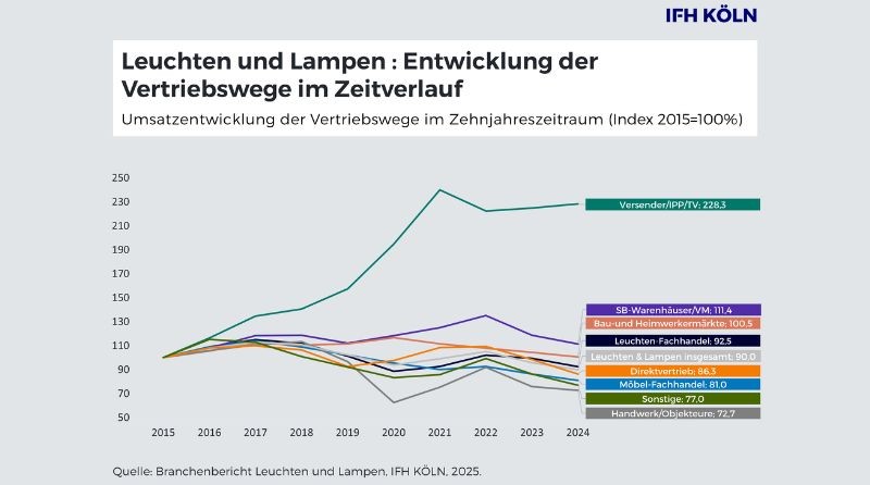 2024 erneuter Markteinbruch bei Leuchten und Lampen. Umsätze verzeichnen Minus von 6,1 Prozent. Moderat rückläufige Trendentwicklung auch 2025 und in den kommenden vier Jahren prognostiziert. LED-Technologie bleibt zentraler Grund für Umsatzverluste mit Lampen. Internetspezialisten einziger Vertriebsweg mit positiver Entwicklung.