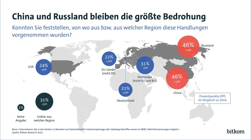 Erneut zugenommen haben Taten, die nach Russland und China zurückverfolgt werden konnten. Von den betroffenen Unternehmen haben 46 Prozent mindestens einen Angriff aus Russland (2024: 39 Prozent) festgestellt, ebenso viele aus China (2024: 45 Prozent). Mit deutlichem Abstand folgen Attacken aus Osteuropa außerhalb der EU (31 Prozent, 2024: 32 Prozent), aus den USA (24 Prozent, 2024: 25 Prozent), aus EU-Ländern (22 Prozent, 2024: 21 Prozent) sowie Deutschland (21 Prozent, 2024: 20 Prozent). Rund jedes dritte Unternehmen (31 Prozent, 2024: 36 Prozent) konnte die Angriffe keinem Herkunftsland zuordnen. Dabei nehmen ausländische Geheimdienste die deutsche Wirtschaft verstärkt ins Visier. 28 Prozent der betroffenen Unternehmen konnten mindestens einen Angriff einem ausländischen Nachrichtendienst zuordnen, vor einem Jahr waren es erst 20 Prozent, 2023 sogar nur 7 Prozent. Am häufigsten kamen die Täter jedoch aus der organisierten Kriminalität (68 Prozent, 2024: 70 Prozent). 35 Prozent der angegriffenen Unternehmen, die Täter ermittelt haben, konnten die Behörden bei der Spurensuche helfen, 2024 waren es erst 24 Prozent. Damit ist dieser Austausch mit staatlichen Stellen inzwischen wirksamer als interne (32 Prozent) oder externe (20 Prozent) Untersuchungen.