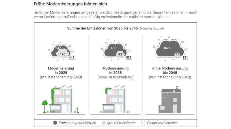 Eine Kurzstudie der Deutschen Gesellschaft für Nachhaltiges Bauen kommt zu dem Schluss, dass bauwerksbezogene Emissionen bei Neubauten in der Regel wesentlich höher sind als bei Sanierungen.