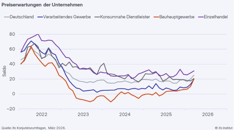 Der jüngste Anstieg der Preiserwartungen steht laut Wohlrabe im Zusammenhang mit deutlich höheren Preisen für Rohöl, Gas und Strom infolge des Kriegs im Nahen Osten. Nachdem die Energiekomponente die Inflation zuletzt gedämpft hatte, zeichnet sich nun eine Umkehr ab. „Die Unternehmen geben steigende Kosten zunehmend weiter“, so Wohlrabe. „Über höhere Produktions- und Transportkosten werden die Energiepreise auch auf Waren und Dienstleistungen durchschlagen.“