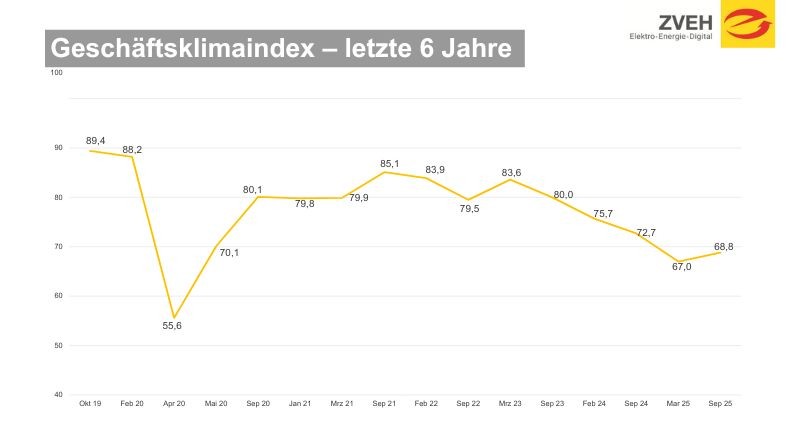 Dramatische Veränderungen hinsichtlich der wirtschaftlichen Situation bleiben zwar aus. Jedoch zeigt die aktuelle Herbstkonjunkturumfrage des Zentralverbandes der Deutschen Elektro- und Informationstechnischen Handwerke (ZVEH) trotz eines leichten Anstiegs im Geschäftsklimaindex: Viele Betriebe sind verunsichert und schauen verhalten bis pessimistisch in die nähere Zukunft. Zudem gaben 26,5 Prozent der befragten Betriebe an, dass die Umsätze mit handwerklichen Leistungen gesunken seien (Frühjahr 2025: 23,4 Prozent). Bei 48,5 Prozent blieben sie unverändert (Frühjahr 2025: 46,5 Prozent), bei 25,0 Prozent waren sie gestiegen (Frühjahr 2025: 30,1 Prozent).